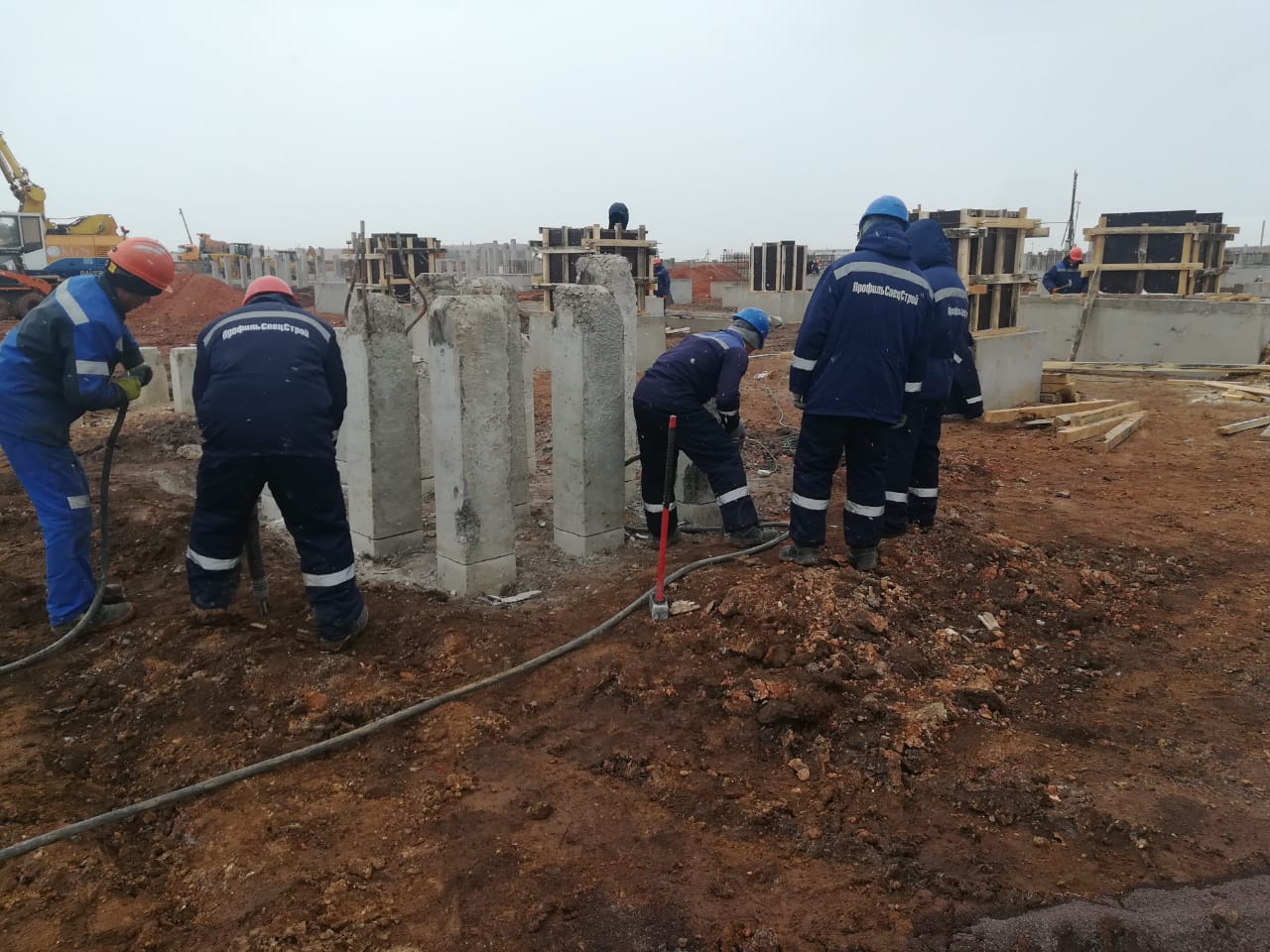 Проект: Многоквартирный жилой комплекс со встроенными помещениями и паркингом, школы на 1200 мест, детского сада по адресу: г. Нур-Султан, район «Алматы», пересечение улиц А129, А105, А130, А108, А102. Кладочные работы, монтаж стеновых панелей, плотнические работы, ТОО «ОзатКазСтрой», 2020-2021 года.